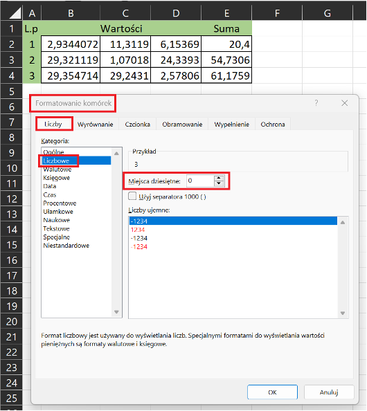 W sekcji "Liczby dziesiętne" wybierz ilość miejsc po przecinku.