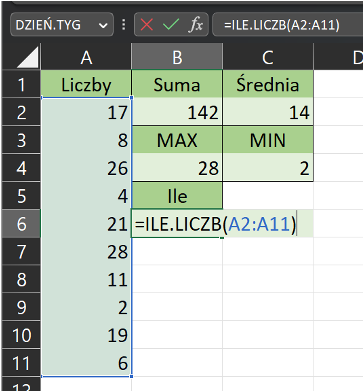 ILE.LICZB: Funkcja ILE.LICZB służy do zliczania ilości komórek w wybranym zakresie, które zawierają liczby. Na przykład, aby zliczyć ilość komórek w zakresie A1:A10, które zawierają liczby, można wpisać formułę =ILE.LICZB(A2:A11) w innej komórce.