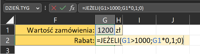 Sprawdza, czy wartość w komórce G1 jest większa niż 1000 zł. Jeśli tak, to funkcja IF zwraca 10% wartości zamówienia (obliczonej przez pomnożenie wartości w komórce G1 przez 0,1). Jeśli wartość zamówienia jest mniejsza lub równa 1000 zł, to funkcja IF zwraca 0, co oznacza, że nie ma rabatu.