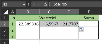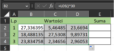 Można wygenerować losowe liczby z przedziału od 0 do 30 w programie Microsoft Excel przy użyciu funkcji LOS(). Aby to zrobić, należy: