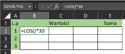 Wpisać formułę: =LOS()*30