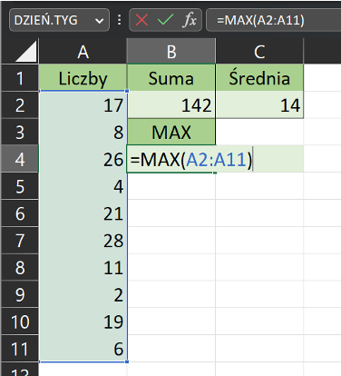 MAX - zwraca największą wartość w wybranej komórce lub zakresie komórek. Na przykład, "=MAX(A1:A10)" zwraca największą wartość w komórkach A1 do A10.