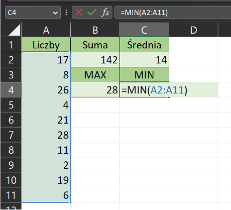 MIN: Funkcja MIN służy do znajdowania minimalnej wartości w wybranym zakresie komórek. Na przykład, aby znaleźć minimalną wartość w komórkach A1 do A10, można wpisać formułę =MIN(A2:A11) w dowolnej innej komórce.