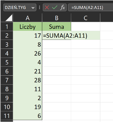SUMA: Funkcja SUMA służy do sumowania wartości w wybranym zakresie komórek. Na przykład, aby zsumować wartości w komórkach A2 do A11, można wpisać formułę =SUMA(A2:A11) w innej komórce.