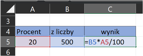 Obliczanie procentu: Aby obliczyć procent, należy pomnożyć wartość przez procent i podzielić wynik przez 100. Na przykład, aby obliczyć 20% z wartości 500, można wpisać formułę =B5*A2/100 w innej komórce.