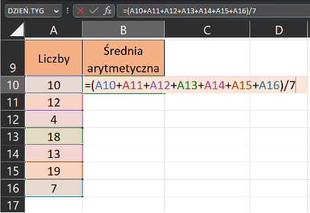 Obliczanie średniej arytmetycznej: Aby obliczyć średnią arytmetyczną, należy dodać wszystkie wartości i podzielić sumę przez liczbę wartości. Na przykład, aby obliczyć średnią wartość w komórkach A10 do A16, można wpisać formułę =(A10+A11+A12+A13+A14+A15+A16)/7 w dowolnej innej komórce. W przypadku tego rodzaju działań pamiętaj o nawiasach w odpowiednim miejscu.