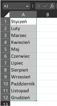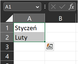 Na przykład, jeśli wpiszesz "Styczeń" w komórce A1 i "Luty" w komórce A2, możesz przeciągnąć kursor z A2 w dół, a Excel automatycznie uzupełni resztę komórek kolejnymi miesiącami.