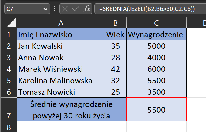 W tym przykładzie, funkcja JEŻELI jest używana do wyboru tylko tych wierszy, dla których wiek jest powyżej 30 roku życia, a funkcja ŚREDNIA jest używana do obliczenia średniego wynagrodzenia dla tych osób.