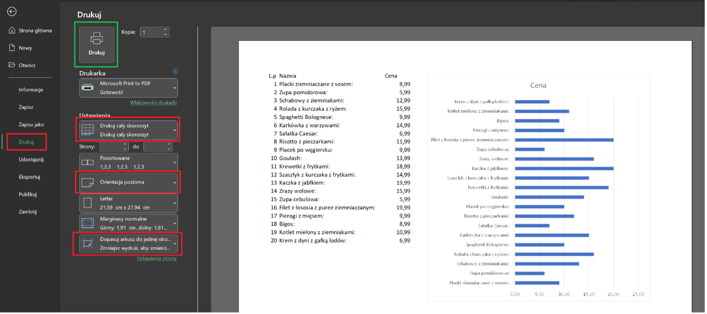 Jeśli arkusz zawiera wiele kolumn i nie mieści się na jednej stronie, można zmienić orientację na poziomą oraz włączyć opcję Dopasuj arkusz do jednej strony, aby cały zestaw danych znalazł się w jednym czytelnym wydruku.