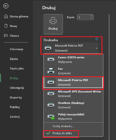 Oprócz standardowego drukowania istnieje także opcja drukowania do pliku (np. w formacie PDF), co pozwala zachować układ arkusza i przesłać go osobie korzystającej z innej drukarki lub systemu.