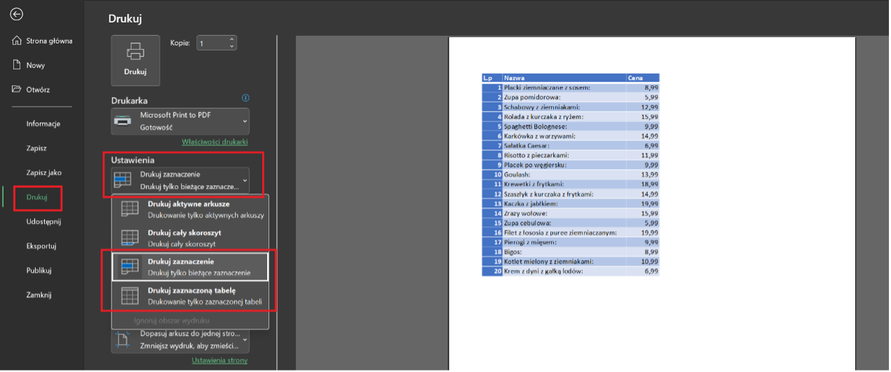 zakres wydruku (cały arkusz, wybrane strony lub zaznaczenie),