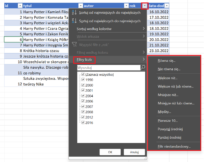 Filtrowanie – możemy filtrować tekst na kilka sposobów, rozwijając wiersz nagłówka > filtr tekstu > wybierając jedną z wielu. Sprawdzając czy wyraz: równa się, nie równa się, zaczyna się od, Kończy się na, zawiera, nie zawiera lub zastosować filtr niestandardowy. Tak samo sprawa wygląda w przypadku danych liczbowych, daty i innych typów danych.