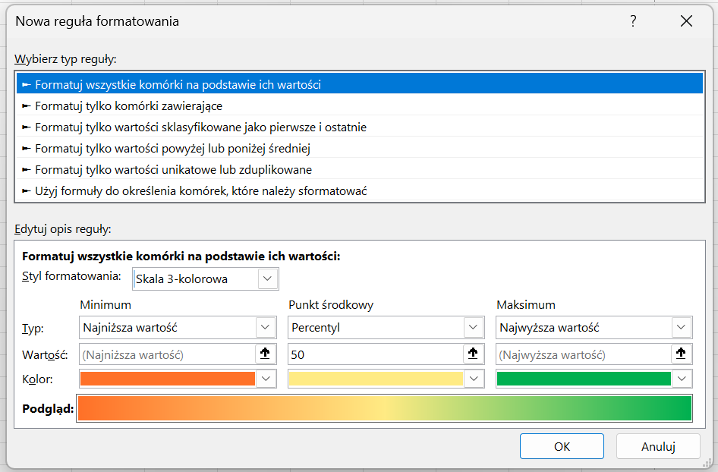 Wybieramy typ reguły: Formatuj wszystkie komórki na podstawie ich wartości.
