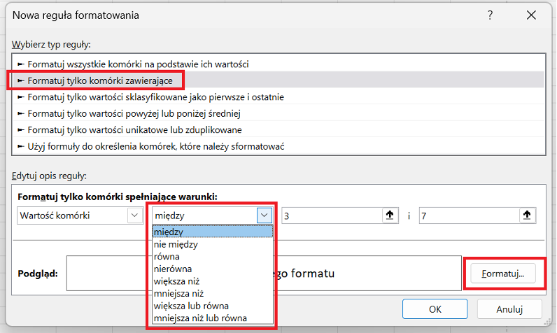 Aby wskazać sposób wyróżniania takich komórek, należy kliknąć przycisk Formatuj… i ustawić wybrane opcje, np. kolor tła, czcionki, obramowanie czy styl liczby. Dzięki temu komórki spełniające warunki będą natychmiast wyróżnione, co ułatwia analizę danych.