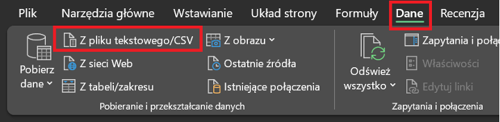 Przejdź do zakładki Dane i wybierz opcję Z pliku tekstowego/CSV.
