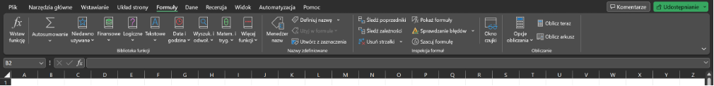 Karta Formuły - zawiera funkcje, które możemy użyć do obróbki danych. Mamy do dyspozycji wstawianie funkcji, bibliotekę funkcji, nazwy zdefiniowane, inspekcja formuł oraz obliczenia.