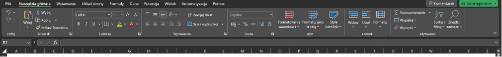 Karta Narzędzia główne - w tym miejscu znajdują się wszystkie podstawowe narzędzia niezbędne przy pracy nad arkuszem. Znajdziemy tutaj opcje formatowania tekstu (czcionki, jej kolor, rozmiar i wyrównanie), konfigurowania formatów liczb, formatowania tabel i komórek oraz znajdowania, filtrowania i sortowania danych zawartych w arkuszu.