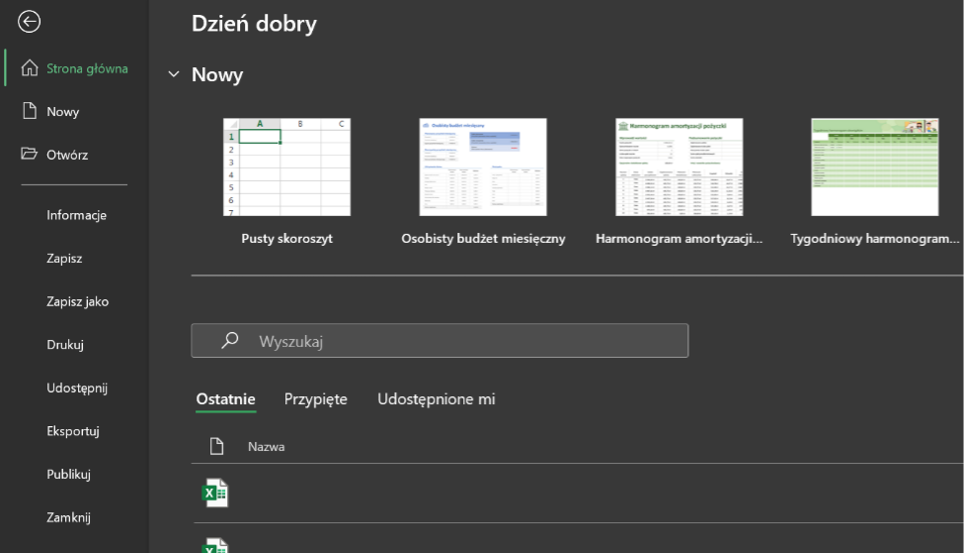 Po uruchomieniu programu Excel ukazuje się nam okno tworzenia nowego arkusza. Możemy wybrać pusty arkusz albo jeden z dostępnych szablonów.