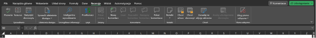Karta Recenzja - tutaj znajdują się opcje sprawdzania dostępu oraz wyświetlania i edycji komentarzy.