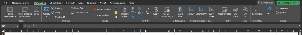 Karta Wstawienie - za pomocą narzędzi zebranych w tej karcie możemy wstawić do arkusza tabele, ilustracje, dodatki pakietu Office, wykresy, wykresy przebiegu w czasie, filtry, linki, komentarze oraz symbole.