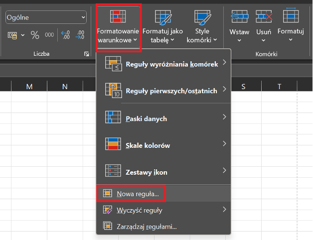 Wybieramy Narzędzia główne > Formatowanie warunkowe > Nowa reguła