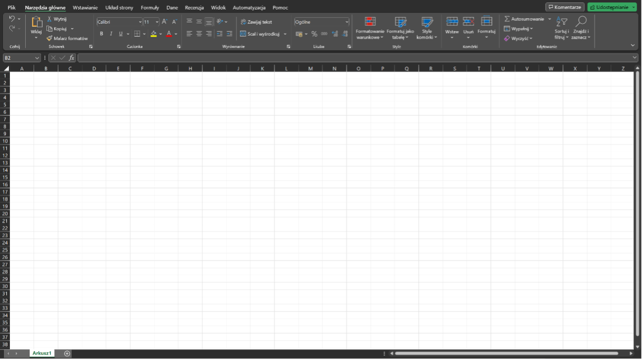 Po utworzeniu nowego skoroszytu mamy już dostęp do pełnych opcji programu. Na przestrzeń roboczą składają się narzędzia pogrupowane w kartach na górnym pasku narzędziowym oraz sam arkusz. Na dole okna mamy możliwość zarządzania arkuszami, możemy dodawać i usuwać arkusze, zmieniać ich nazwy i kolejność.