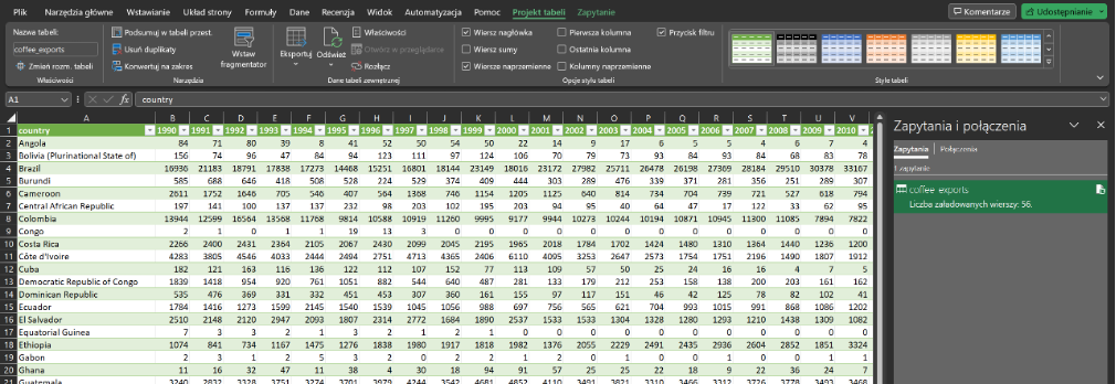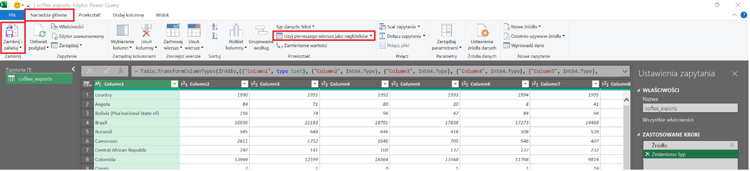 Jeśli plik zawiera nagłówki w pierwszym wierszu, kliknij przycisk Przekształć dane, aby otworzyć Edytor Power Query. Tam możesz dodatkowo dostosować wygląd tabeli i zaznaczyć opcję Użyj pierwszego wiersza jako nagłówków.