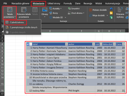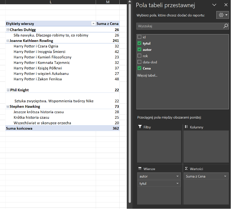 Załóżmy, że mamy listę książek z tytułem, autorem i ceną. W tabeli przestawnej możemy ustawić: