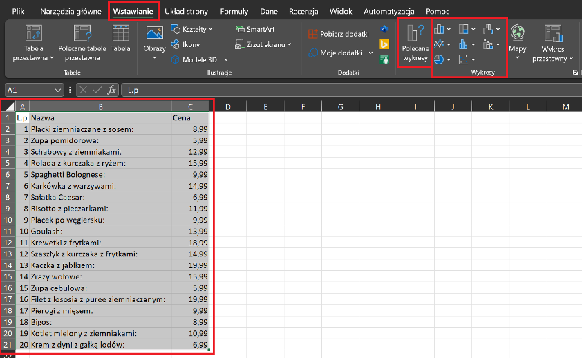 Przejdź do zakładki Wstawianie i wybierz opcję Polecane wykresy lub od razu wskaż jeden z typów dostępnych w sekcji Wykresy (np. kolumnowy, liniowy, kołowy).