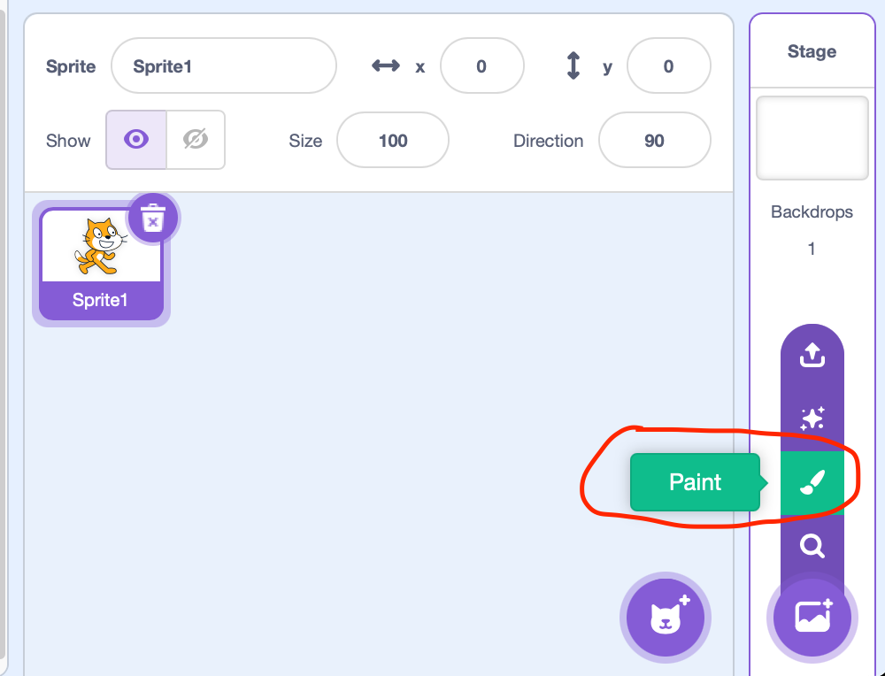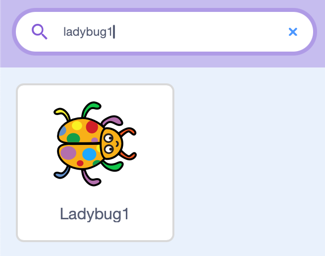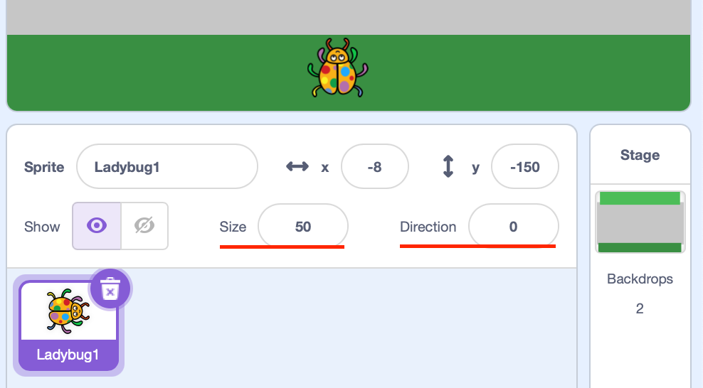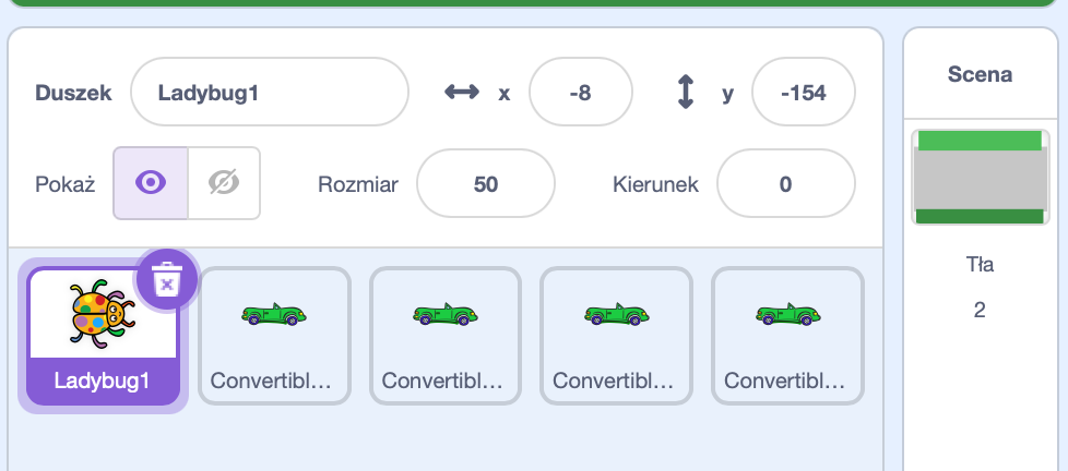 Pierwszego duszka wgrywamy z biblioteki ("Ladybug1"). Oraz możemy zmienić jego rozmiar na 50.