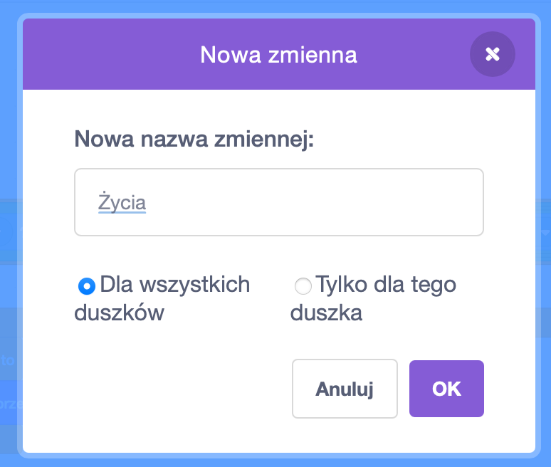 W zakładce Dane tworzymy zmienną, odpowiedzialną za określanie liczby naszych żyć. Klikamy "Utwórz zmienną" i w oknie wpisujemy "Zycia".
