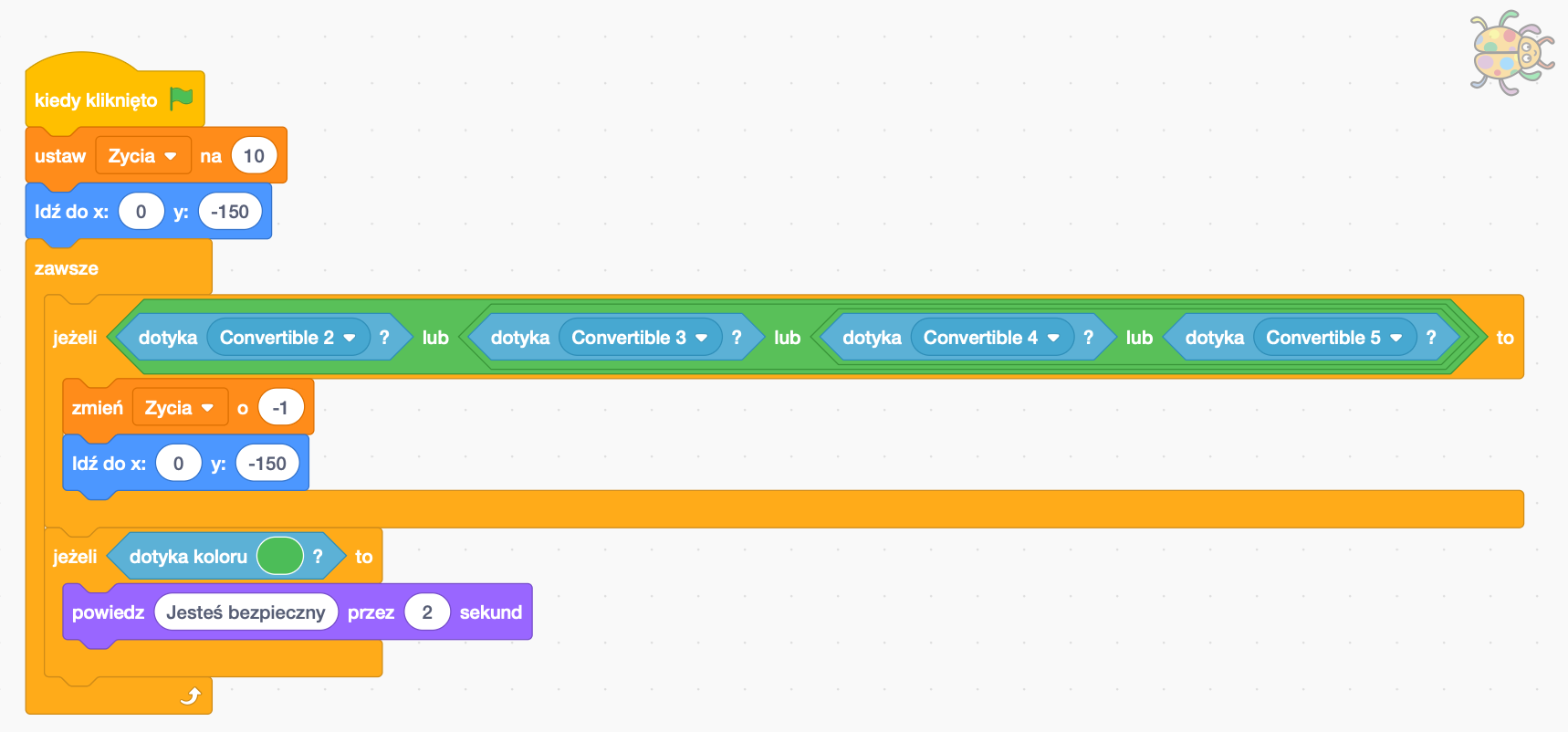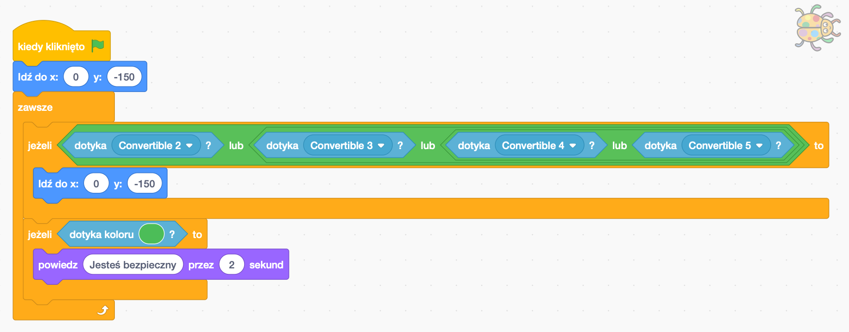 Po naciśnięciu Zielonej Flagi robaczek zostaje umieszczony na samym dole planszy (współrzędne startowe). Robaczek ma reagować na zderzenie z samochodami. Użyjemy do tego instrukcji warunkowej "jeżeli ... to". Duszek będzie reagował na duszki samochodów "Dotyka {nazwa_duszka}", z niebieskiej zakładki czujniki. Drugi warunek "jeżeli ... to" sprawdza, czy dotarliśmy do końca planszy. Jeżeli dotykamy duszka samochodu wracamy do położenia startowego. Jeżeli natomiast dotykamy koloru znajdującego się na końcu planszy robaczek informuje nas, że jesteśmy bezpieczni.