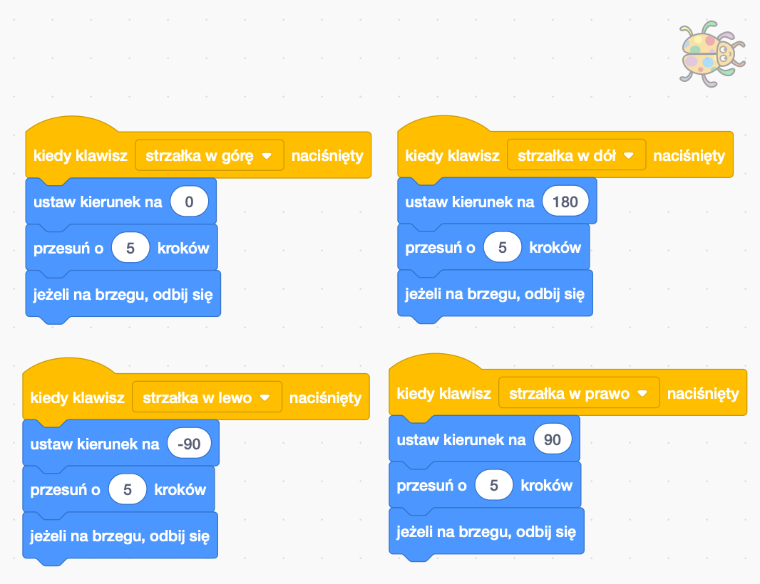 Na początku ustawimy sterowanie naszego duszka przy pomocy strzałek. Przechodzimy do pomarańczowej zakładki Zdarzenia i wybieramy bloczek "kiedy klawisz ... naciśnięty", z listy rozwijanej wybieramy strzałka w górę. Po każdym wciśnięciu strzałki w górę rozpocznie się wykonywanie tej części skryptu. Do bloczka "kiedy klawisz ... naciśnięty" podczepiamy trzy bloczki odpowiedzialne za ruch (niebieska zakładka Ruch). Na początku ustawiamy kierunek, w którą ma się przesunąć nasz obiekt - bloczek "ustaw kierunek na 0". Następnie przesuwamy naszego duszka, o określoną ilość kroków - bloczek "przesuń o 5 kroków". Im większą wartość wpiszemy tym szybciej będziemy się poruszać po planszy. Ostatni bloczek uniemożliwia opuszczenie planszy "jeżeli na brzegu, odbij się".
