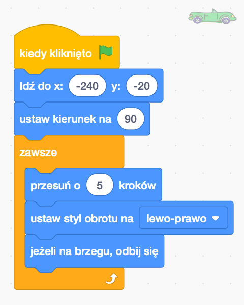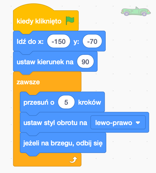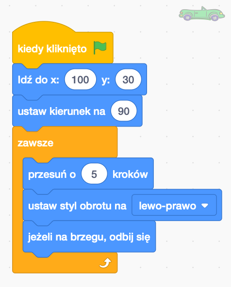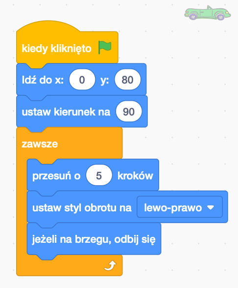 Będzie to nasz samochód. Będzie się on poruszał pomiędzy krawędziami planszy. Wykorzystamy do tego pętlę zawsze, znającą się w pomarańczowej zakładce Kontrola. Po naciśnięciu Zielonej Flagi zostaje on umieszczony na drodze. Jego kierunek zostaje ustawiony w prawo (90). Zawsze będzie przesuwał się o 5 kroków. Jeżeli będzie znajdował się na brzegu odbije się od niego i będzie poruszał się w drugim kierunku.