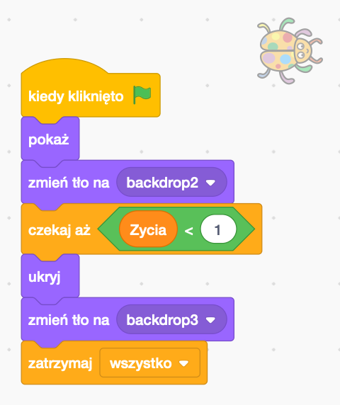 Dodajemy skrypt powodujący zmianę tła oraz zniknięcie duszka. Po naciśnięciu Zielonej Flagi robaczek musi się pokazać. Tło zostaje zmieniona na „tło1”. Program będzie oczekiwał, aż punkty spadną poniżej 1 (łączymy ze sobą bloczki "czekaj aż ..." z zakładki Kontrola, "Zycia" z zakładki Dane oraz "...<..." z zakładki Wyrażenia). Po spełnieniu warunku program będzie wykonywany dalej. Tło zmieni się na "tło2". Duszek zostanie ukryty, po czym cała gra ulega zatrzymaniu (bloczek "zatrzymaj wszystko" z zakładki Kontrola).